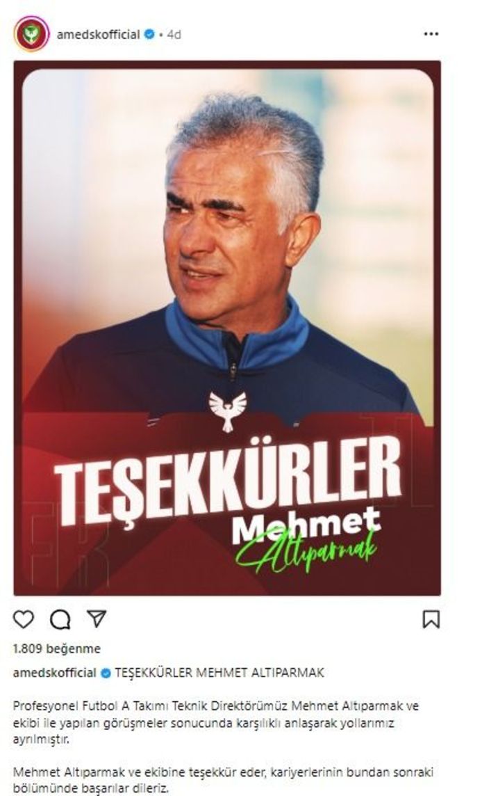 Trendyol 1. Lig ekiplerinden Amed Sportif Faaliyetler, teknik direktör Mehmet Altıparmak'ın görevine son verdi.