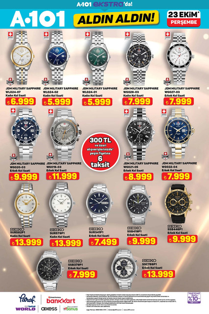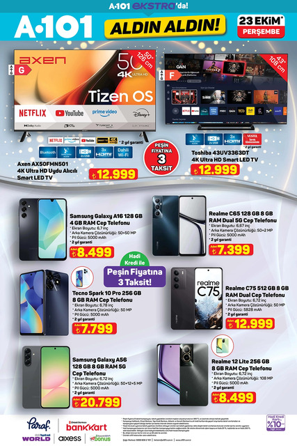 A101 aktüel ürünler kataloğu indirim listesi yayınlandı. 23 Ekim Perşembe gününden itibaren A101 indirimlerinde Hi Level 55UHL750 55" UHD Smart TV 14.999 TL, Hi Level 40HRT900 40" Full HD Uydu Alıcılı Smart TV 7.399 TL, Toshiba 65 İnç UHD Android TV 25.999 TL'den satışa çıktı. İşte, A101 kataloğunun tamamı
