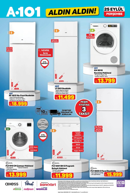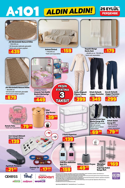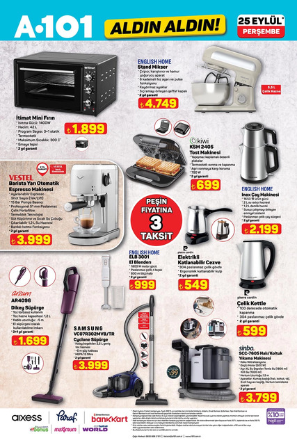 A101 25 Eylül aktüel ürünler kataloğu yayınlandı. Haftalık aktüel kataloğunda hem ev ihtiyaçlarına yönelik küçük elektrikli aletler hem de mutfak, temizlik ve ev tekstil ürünleri uygun fiyattan satışa çıkıyor. İşte, 25 Eylül A101 aktüel ürünler kataloğu tamamı