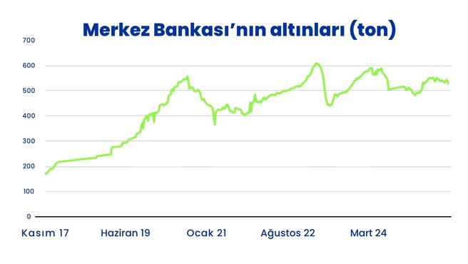 Merkez Bankası’nın altın rezervi büyüklüğünü eylül sonu itibarıyla 562,5 ton olarak, Hazine’nin sahipliğindeki altını da 45,3 ton olarak hesaplanıyor. Merkez Bankası uzun bir süredir altın alımı yapıyor. Küresel ölçekte merkez bankalarının resmi rezervlerinde altının payı yüzde 22 civarında olurken TCMB’nin altın rezervinin toplam rezervleri içindeki payı yüzde 52,6'ya ulaştı.