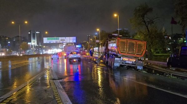 Ataşehir'de yağış nedeniyle kayganlaşan yolda şoförünün direksiyon hakimiyetini kaybettiği hafriyat kamyonu bariyerleri aşarak yan yola girdi. Kazada yaralanan olmazken, olayla ilgili inceleme başlatıldı.