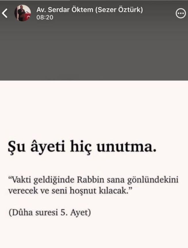 Uğradığı silahlı saldırı sonucu hayatını kaybeden Avukat Serdar Öktem’in bugün 8:20’de WhatsApp uygulamasında yaptığı son paylaşımı: “Vakti geldiğinde Rabbin sana gönlündekini verecek ve seni hoşnut kılacak.”