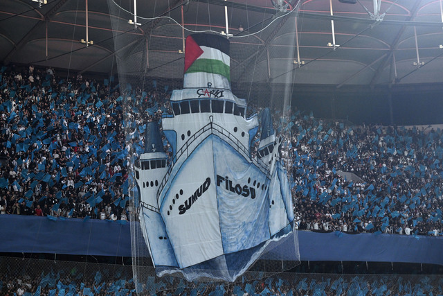 Üzerinde 'Sumud Filosu' yazılı bir gemi koreografisi yapan Beşiktaş taraftarı, 'Free Palestine (Özgür Filistin)' pankartının yanı sıra tribünün geri kalan bölümlerinde de Filistin bayrakları açtı.
