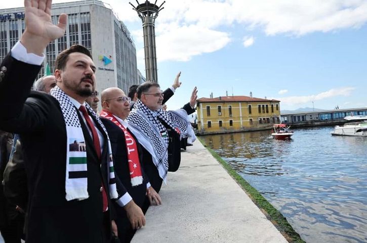 Türk ve Filistin bayrakları asılan teknelere, meydandan toplanan İzmir Sivil Toplum Kuruluşları Platformu üyeleri de ellerindeki Türk ve Filistin bayraklarıyla destek verdi.