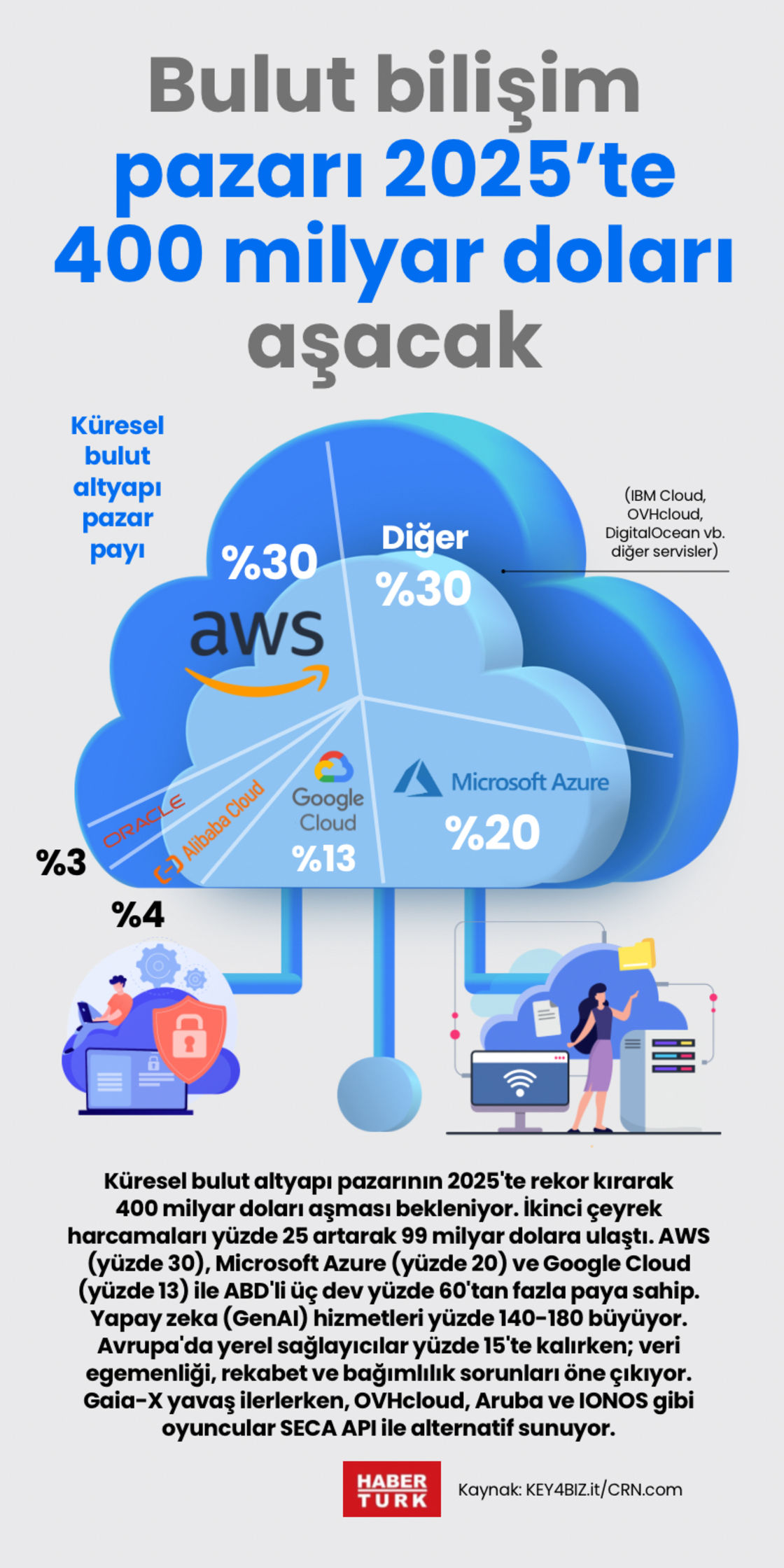 Küresel bulut altyapı pazarının 2025'te rekor kırarak 400 milyar doları aşması bekleniyor. İkinci çeyrek harcamaları yüzde 25 artarak 99 milyar dolara ulaştı. AWS (yüzde 30), Microsoft Azure (yüzde 20) ve Google Cloud (yüzde 13) ile ABD'li üç dev yüzde 60'tan fazla paya sahip. Yapay zeka (GenAI) hizmetleri yüzde 140-180 büyüyor. Avrupa'da yerel sağlayıcılar yüzde 15'te kalırken; veri egemenliği, rekabet ve bağımlılık sorunları öne çıkıyor. Gaia-X yavaş ilerlerken, OVHcloud, Aruba ve IONOS gibi oyuncular SECA API ile alternatif sunuyor.