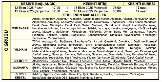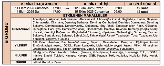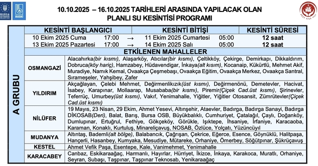 Yapılması planlanan su kesintileri ile günlük 100 bin metreküp su tasarrufu yapılması hedeflenmektedir. Planlı su kesintilerinden Uludağ Üniversitesi, Şehir Hastanesi ve Devlet Hastaneleri etkilenmeyecektir” ifadelerine yer verildi.