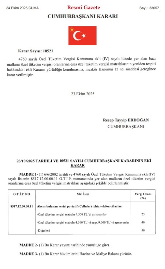 Resmi Gazete'nin bugünkü sayısında yayımlanan ve ÖTV kanununa ekli IV sayılı listede düzenlemeler yapan Cumhurbaşkanı kararına göre, cep telefonlarından (alıcısı bulunan verici portatif cellular telsiz telefon cihazları) alınan ÖTV'nin belirlenmesinde esas alınan vergi matrahı sınırları; yüzde 25 ÖTV uygulanan dilim için 1,500 TL'den 4,500 TL'ye, yüzde 40 ÖTV uygulanan dilim için 1,500 TL-3,000 TL'den 4,500-9,000 TL'ye, yükseltildi. Bu dilimlere dahil olmayan diğer cep telefonları için yüzde 50 oranında ÖTV uygulaması devam edecek.