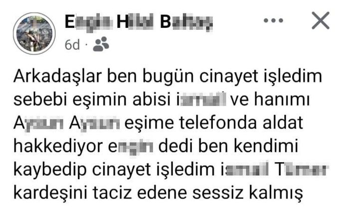 Bu arada Engin Baltaş'ın eşini öldürdükten sonra sosyal medyadan yaptığı paylaşım ortaya çıktı. Paylaşımda, “Arkadaşlar ben bugün cinayet işledim. Sebebi eşimin abisi İ. ve hanımı A., eşime telefonda, ‘Aldat hak ediyor Engin’ dedi. Ben kendimi kaybedip cinayet işledim” ifadeleri yer aldı. Olayla ilgili soruşturma sürüyor.