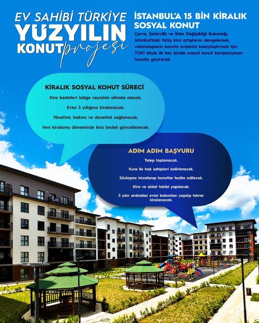 İstanbul’da yapılacak 100.000 konuta ek olarak 15.000 kiralık konut üretilecek. Piyasa rayiç bedelinin altında kiraya verilecek bu konutlardan belirlenen kriterlere uygun vatandaşlar faydalanabilecek. Evler 3 yıl süre ile kiralanacak. Kiralanan konutların; yönetimi, bakımı ve denetimi sağlanacak.