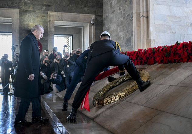 Cumhurbaşkanı Erdoğan'ın, üzerinde ay yıldız bulunan çelengi Atatürk'ün mozolesine bırakmasının ardından saygı duruşunda bulunuldu ve İstiklal Marşı okundu.