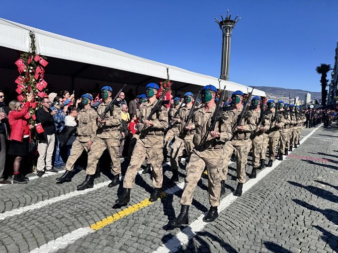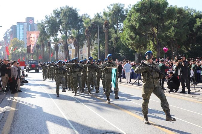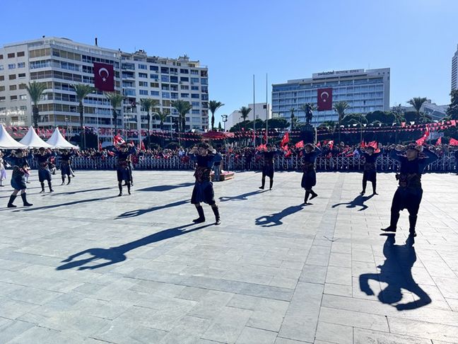 Aydın'da İstasyon Meydanı'ndaki programda, Vali Yakup Canbolat, Büyükşehir Belediye Başkanı Özlem Çerçioğlu ve Tuğgeneral Necip Çarıkcıoğlu askeri araç üzerinden vatandaşları selamladı.