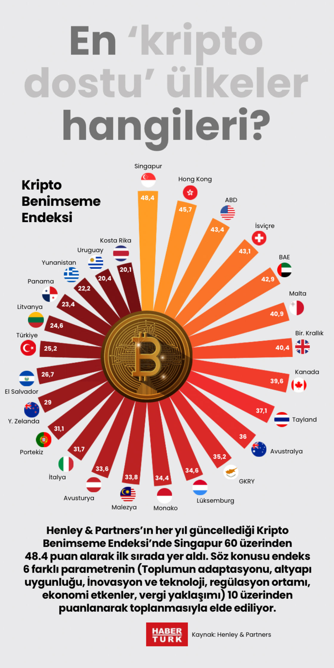 Henley & Partners'ın her yıl güncellediği Kripto Benimseme Endeksi'nde Singapur 60 üzerinden 48.4 puan alarak ilk sırada yer aldı. Söz konusu endeks 6 farklı parametrenin (Toplumun adaptasyonu, altyapı uygunluğu, İnovasyon ve teknoloji, regülasyon ortamı, ekonomi etkenler, vergi yaklaşımı) 10 üzerinden puanlanarak toplanmasıyla elde ediliyor.