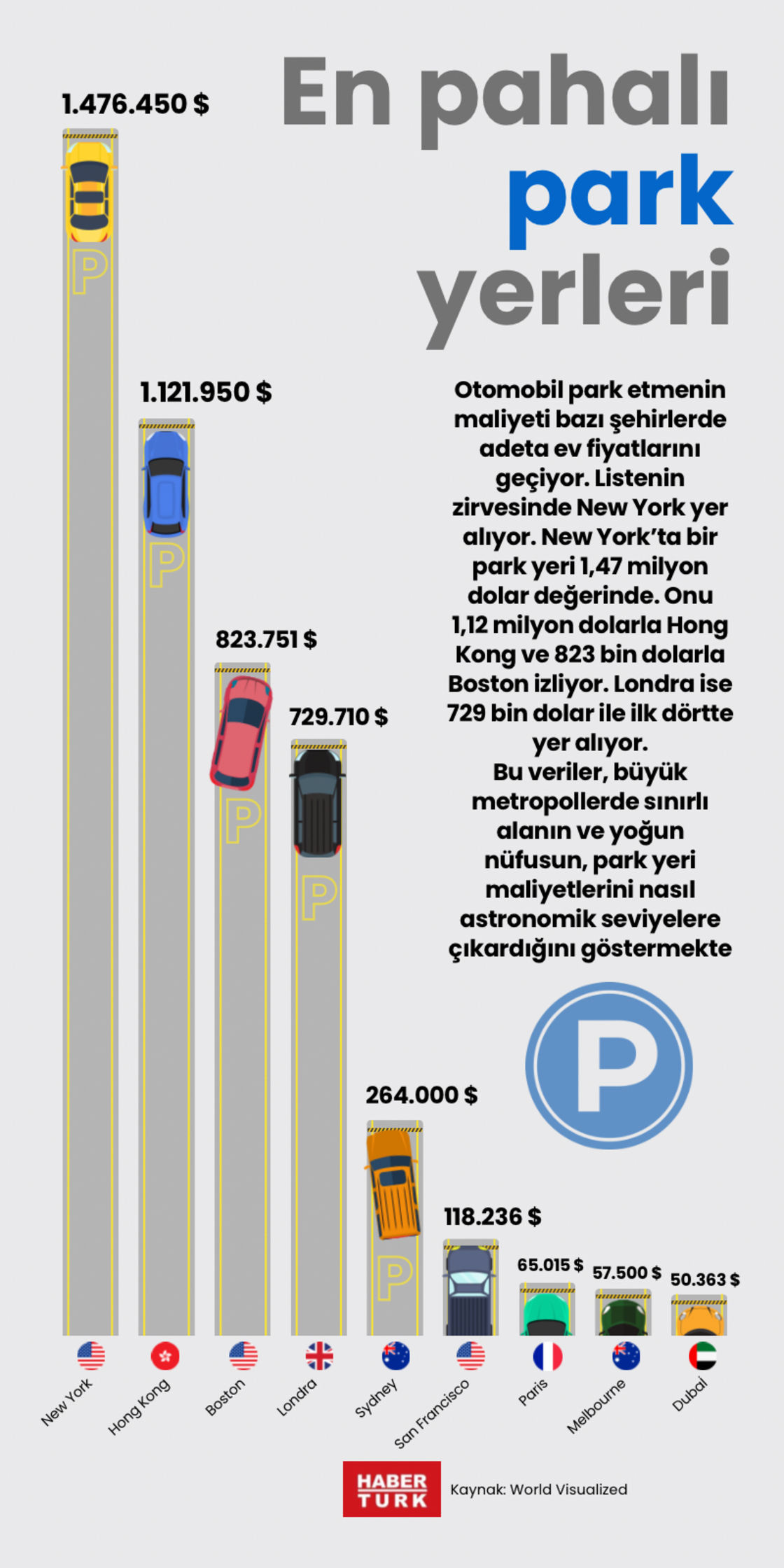 Otomobil park etmenin maliyeti bazı şehirlerde adeta ev fiyatlarını geçiyor. Listenin zirvesinde New York yer alıyor. New York'ta bir park yeri 1,47 milyon dolar değerinde. Onu 1,12 milyon dolarla Hong Kong ve 823 bin dolarla Boston izliyor. Londra ise 729 bin dolar ile ilk dörtte yer alıyor. Bu veriler, büyük metropollerde sınırlı alanın ve yoğun nüfusun, park yeri maliyetlerini nasıl astronomik seviyelere çıkardığını göstermekte