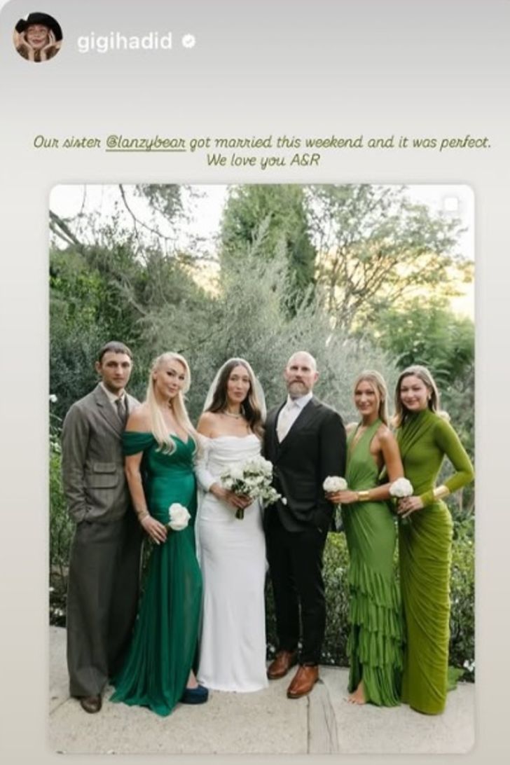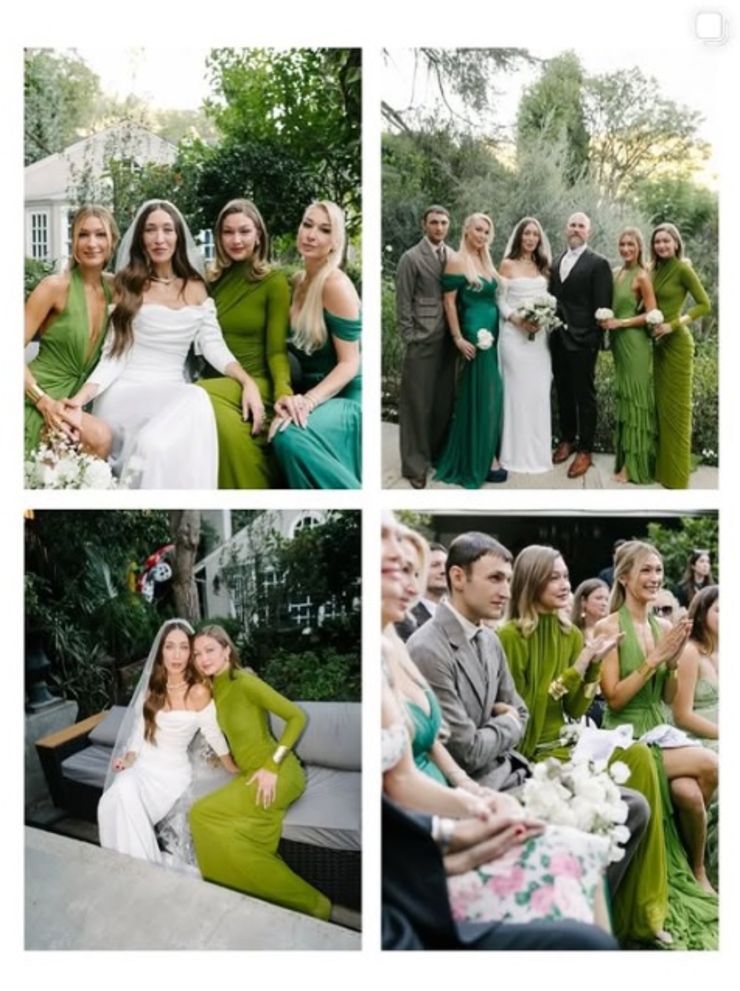 Düğünde Gigi Hadid ile Bella Hadid kardeşler, ablaları Alana Hadid için nikâh töreninde nedime olarak yer aldı. İkili, düğünde yeşil elbise giydi ve açık havada yapılan düğünde bir ara çıplak ayakla yürüdü.