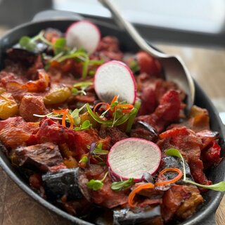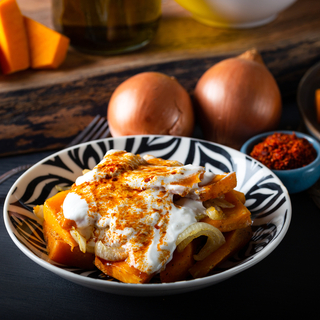 Küp kesilmiş mor soğan ile sarımsaklar zeytinyağında kavrulur. Daha sonra iri parçalar halinde kesilmiş tatlı patates, zencefil, kişniş ve balkabağı püresi ilave edilerek kavurmaya devam edilir. Kavurma işlemi bitince bal kabağının içine sebze stock eklenir. Sebze suyu ilave edildikten sonra 15 dk. daha kaynatılır. Patatesler ve soğanlar piştikten sonra tuz ve beyaz biber ile tatlandırılıp el blender yardımı ile pürüzsüz bir kıvam alana kadar çekilir. 5 dk. daha düşük ısıda kaynatılıp kavrulmuş çam fıstığı ve kabak çekirdeği, roka ve hindistan cevizi kreması ile servis edilir.