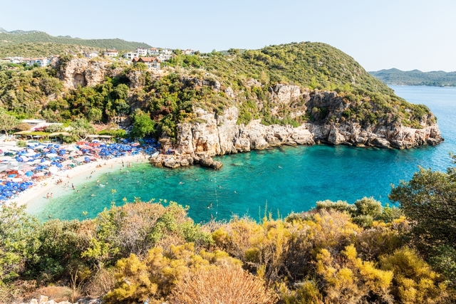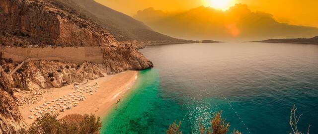 Sezon ortasında, sahil rengarenk şemsiyelerle ve güneş severlerle doluyor. Yüzmeyle geçen uzun bir günün sonunda, Kaş’a geçmeden hemen önce gün batımını izleyebileceğiniz en güzel noktalardan biri burası.