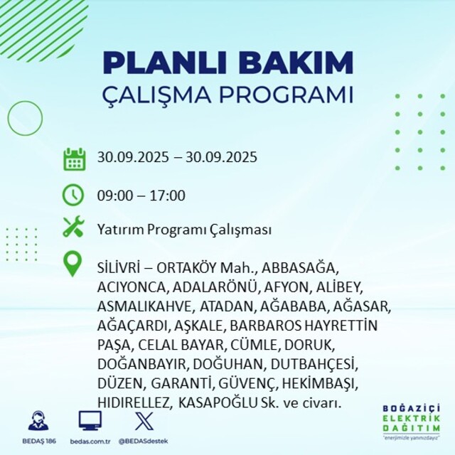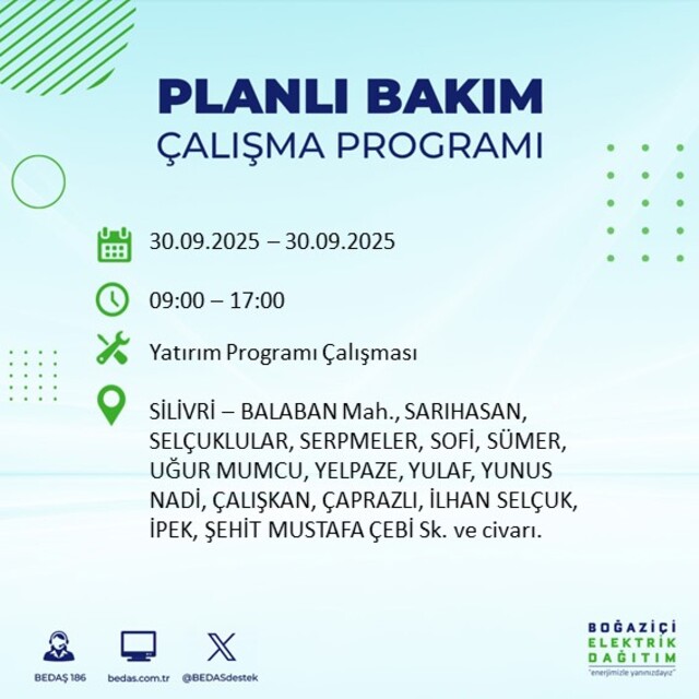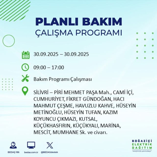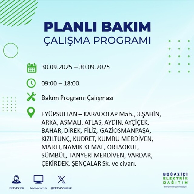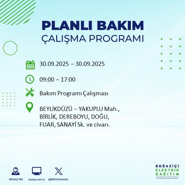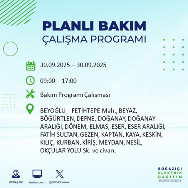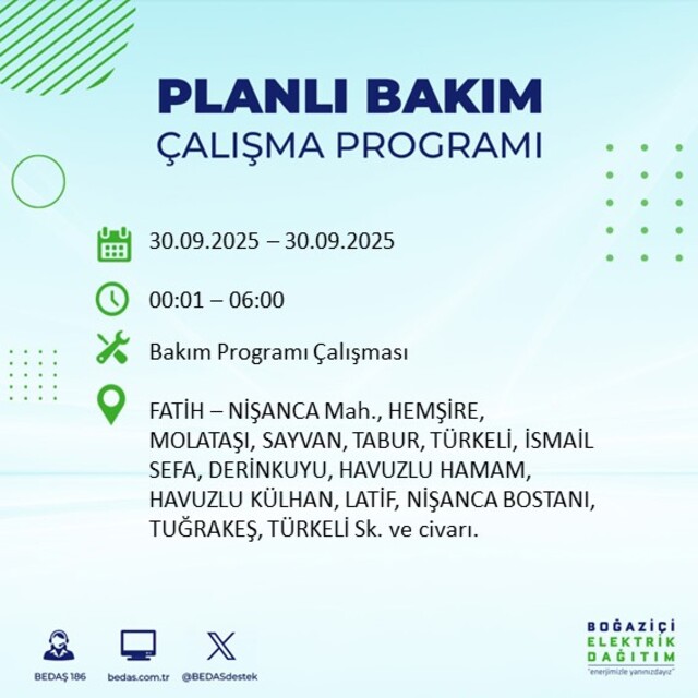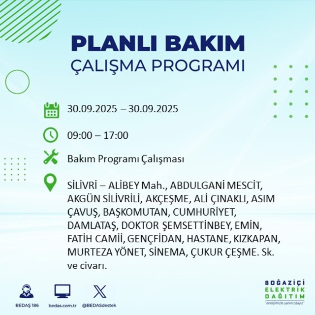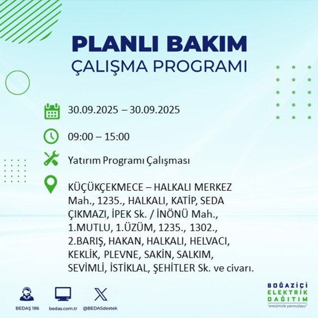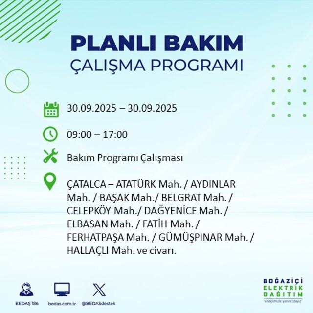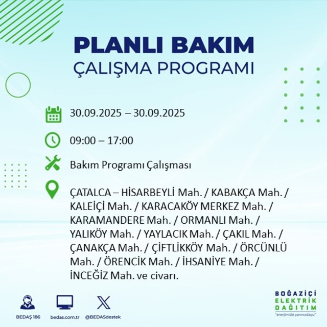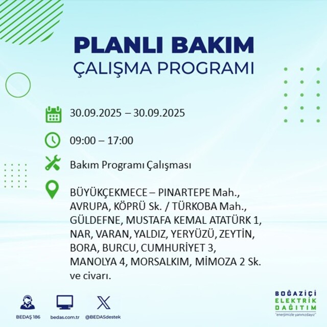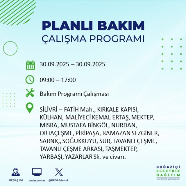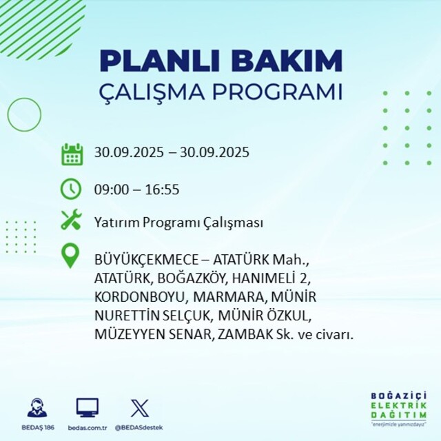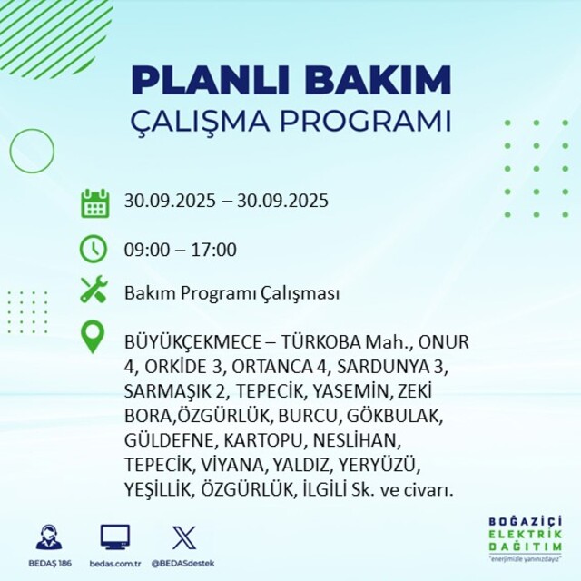BEDAŞ, 30 Eylül 2025 Salı günü İstanbul'un 23 ilçesinde, bakım çalışması kapsamında elektrik kesintisi yaşanacağını açıkladı. İşte, elektriklerin kesileceği ilçeler;