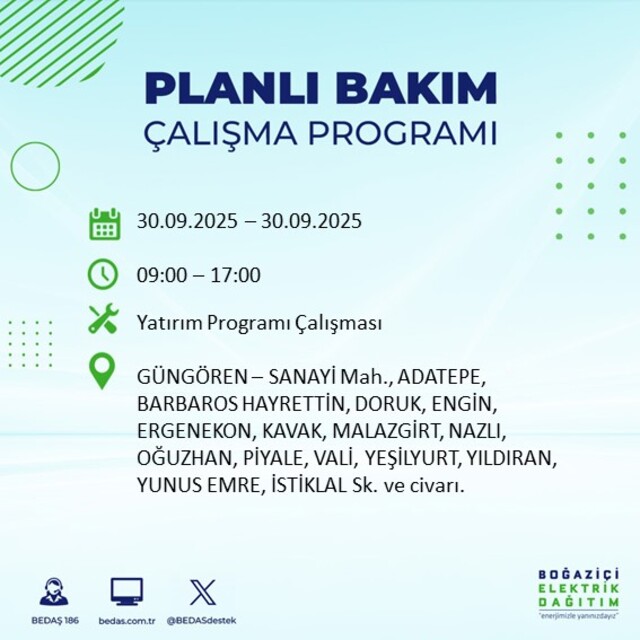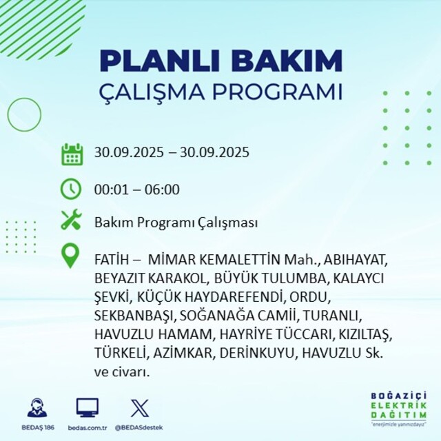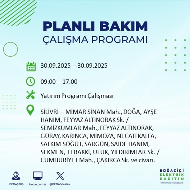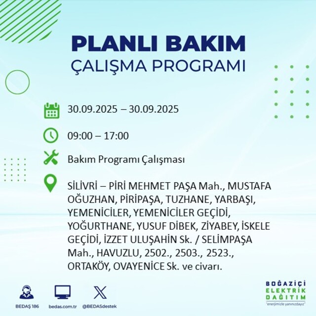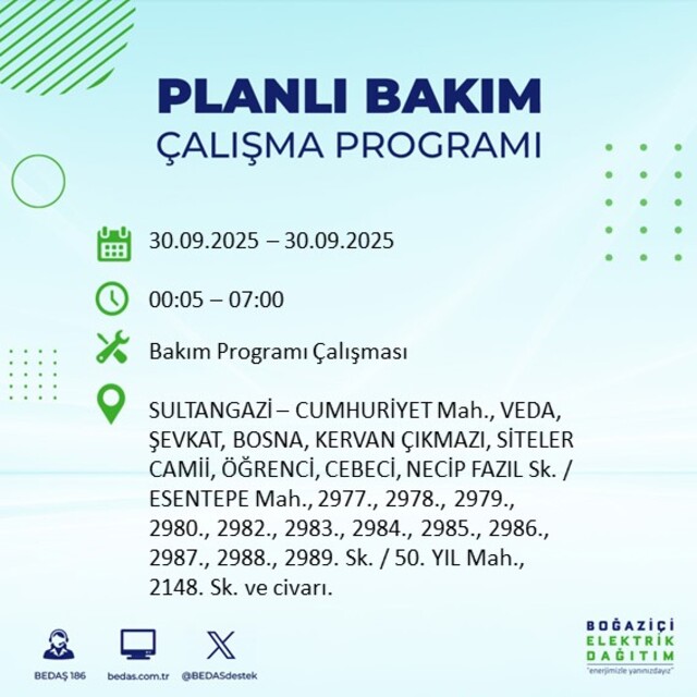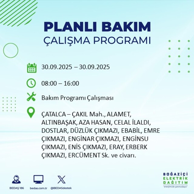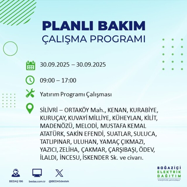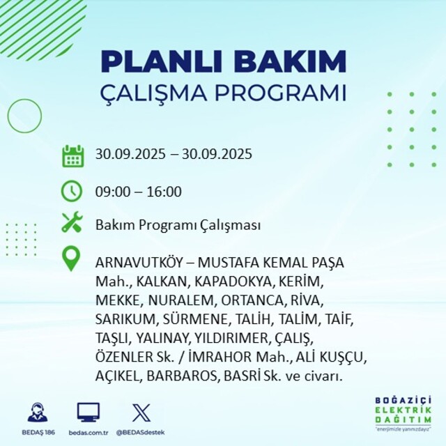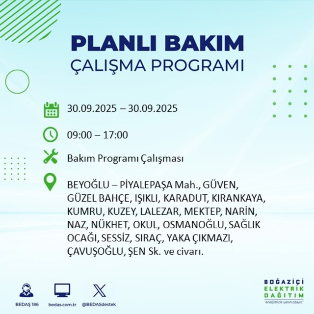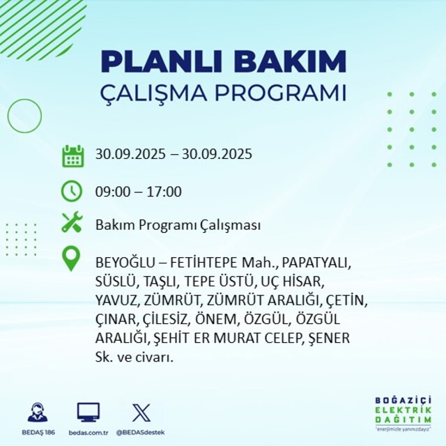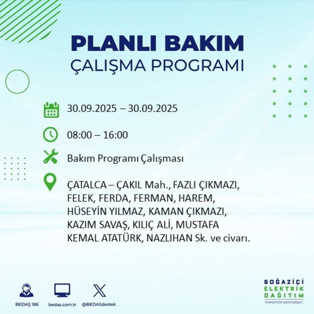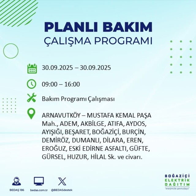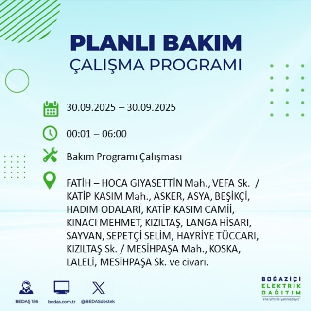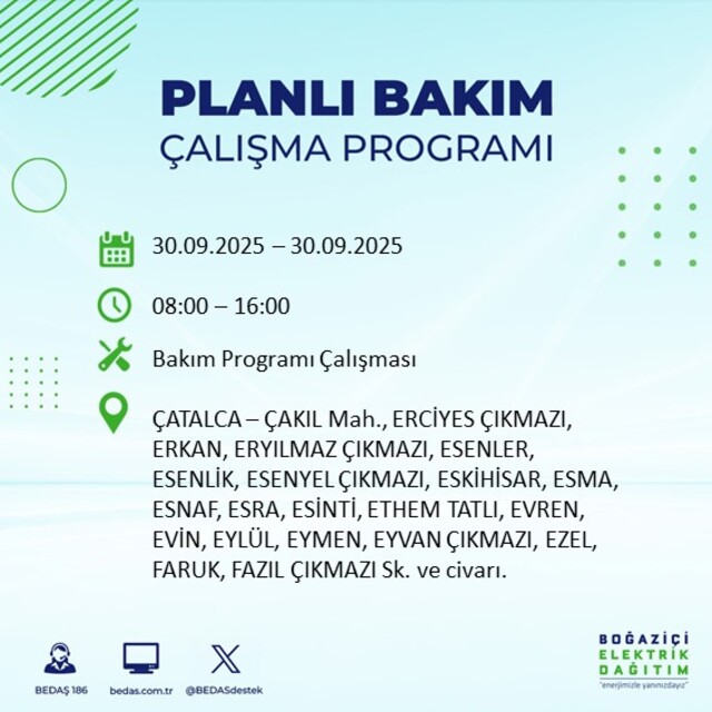 BEDAŞ, 30 Eylül 2025 Salı günü İstanbul'un 23 ilçesinde, bakım çalışması kapsamında elektrik kesintisi yaşanacağını açıkladı. İşte, elektriklerin kesileceği ilçeler;
