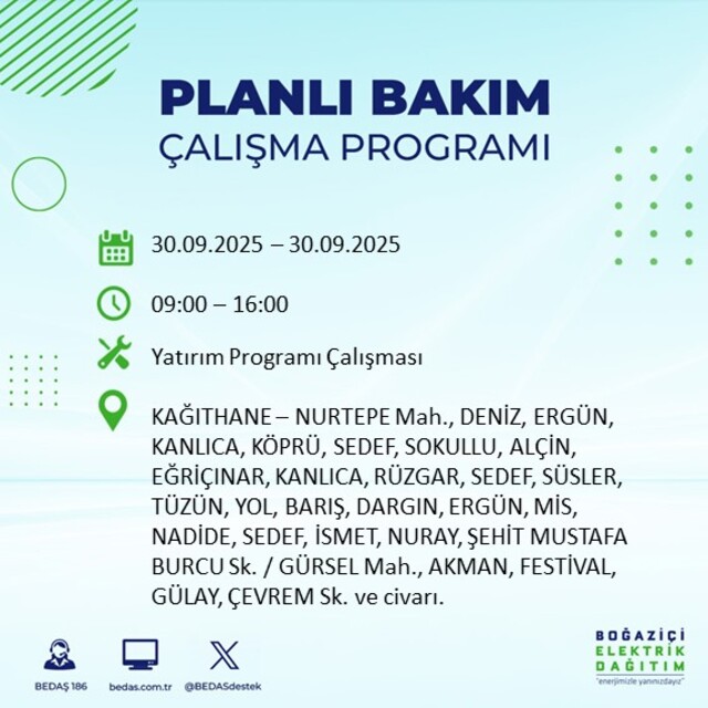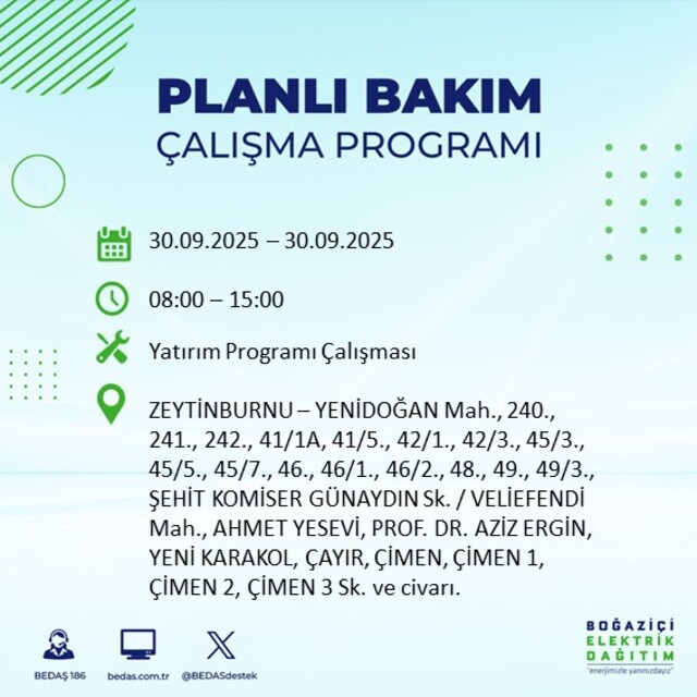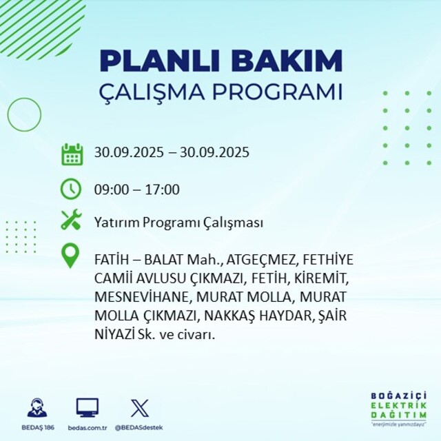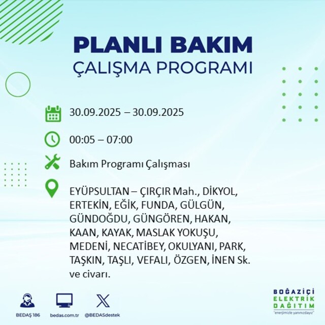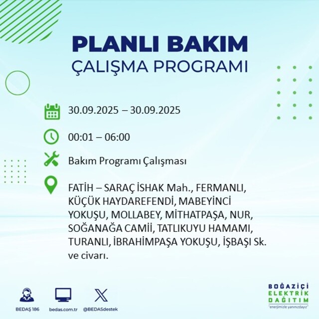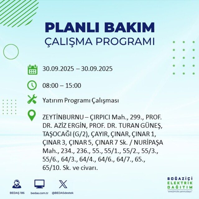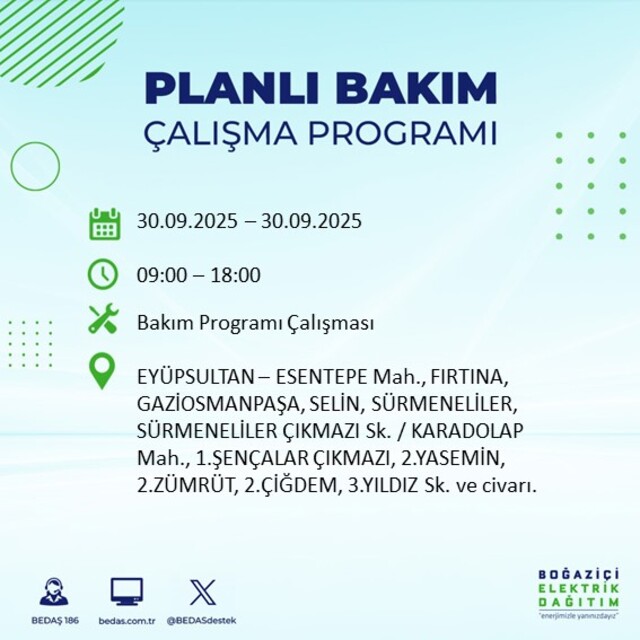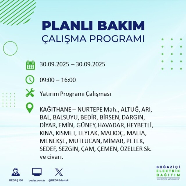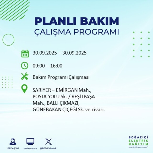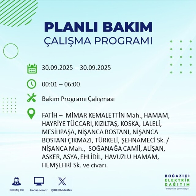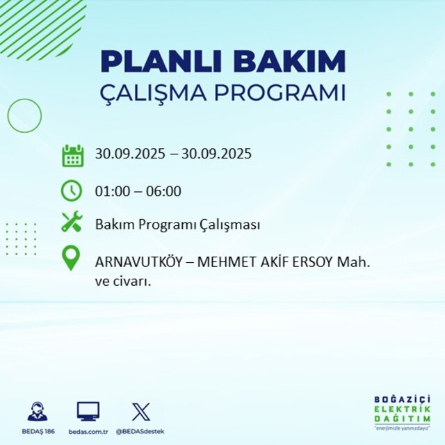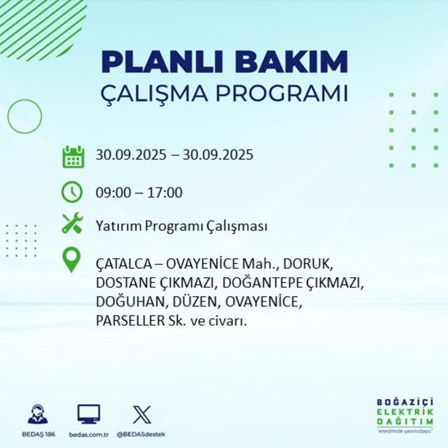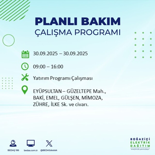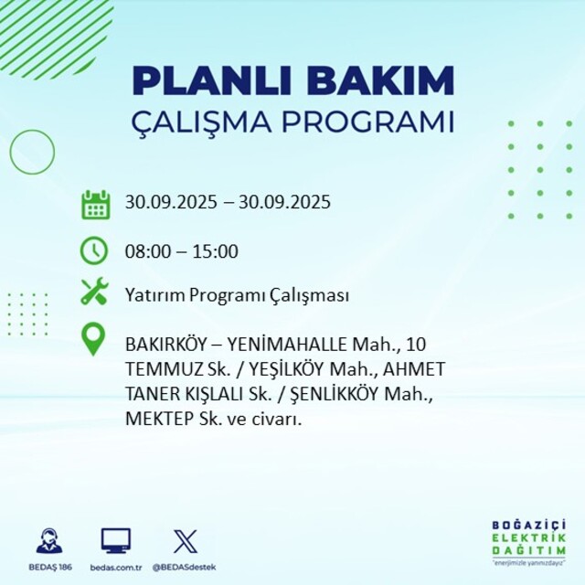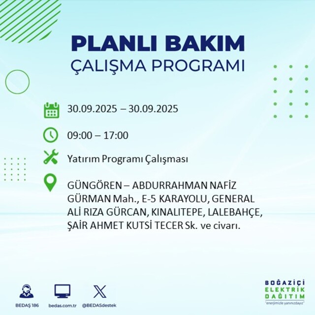 BEDAŞ, 30 Eylül 2025 Salı günü İstanbul'un 23 ilçesinde, bakım çalışması kapsamında elektrik kesintisi yaşanacağını açıkladı. İşte, elektriklerin kesileceği ilçeler;