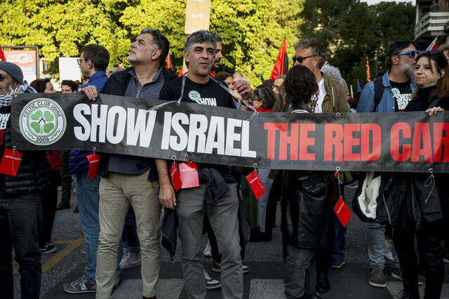 Protestocular, özellikle Gazzede soykırım yaptığı gerekçesiyle "İsrail'e kırmızı kart göster" dövizi taşırken, İsrail'in uluslararası spor müsabakalarından men edilmesi gerektiğini belirtti.