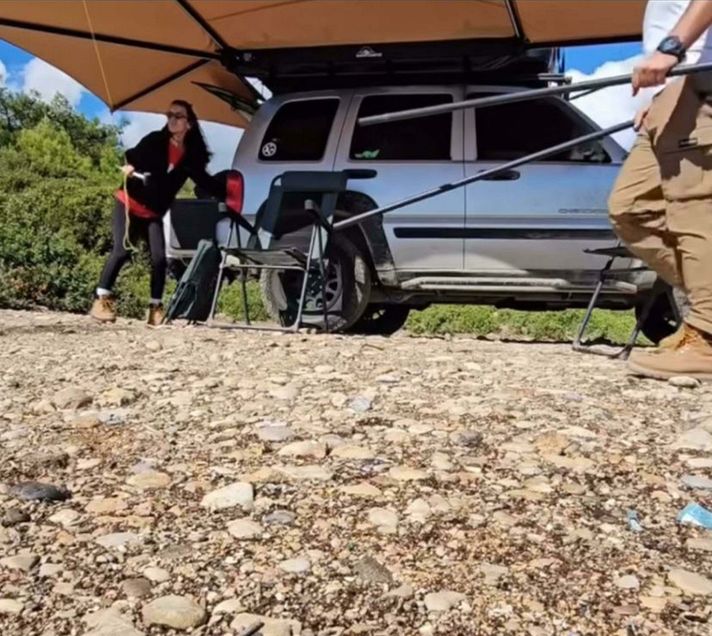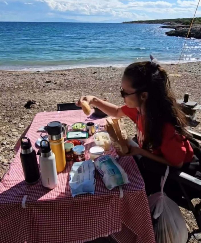 Görüntülerde, çiftin araçla kamp alanına giriş yaptıktan sonra birlikte kahvaltı hazırladıkları anlar yer aldı.
