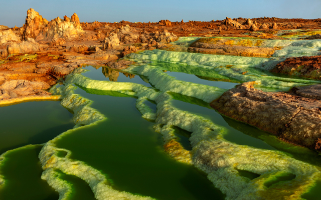 “Yeryüzünün cehennemi” olarak anılan Danakil, 50 °C’yi aşan sıcaklıkları, tuz düzlükleri ve lav akıntılarıyla insan dayanımının sınırlarını zorluyor. Göz kamaştırıcı renkleriyle fotoğrafçılar için cazip olsa da uzun süreli kalışlar hayati risk taşıyor.