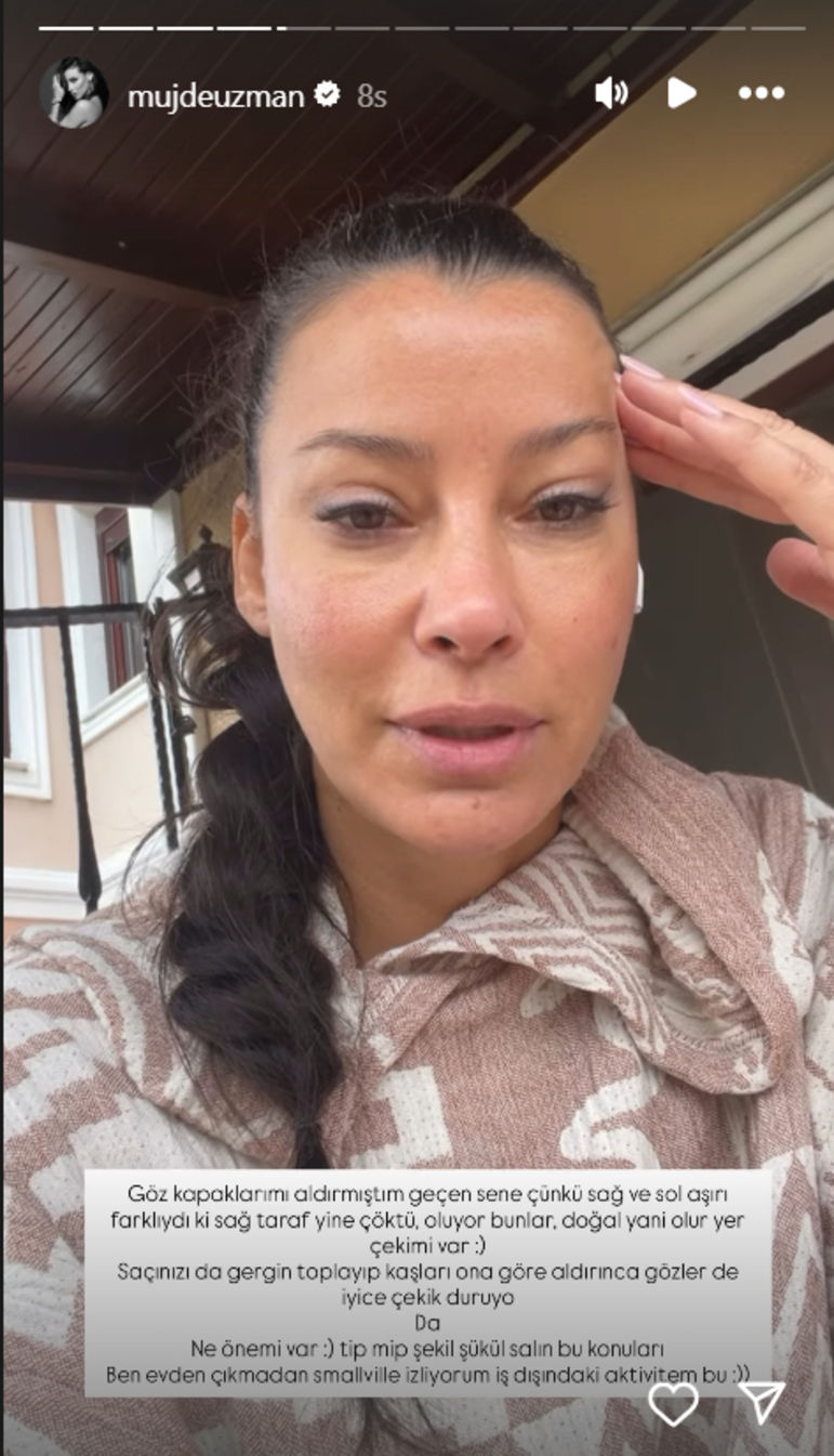 Geçen sene göz kapaklarını aldırdığını açıklayan Müjde Uzman; "Göz kapaklarımı aldırmıştım çünkü sağ ve sol gözlerim çok farklıydı. Ama sağ taraf yine çöktü, oluyor bunlar, doğal yani, yer çekimi var. Saçınızı da gergin toplarsanız ve kaşları ona göre aldırırsanız gözler iyice çekik duruyor. Ne önemi var, tip, şekil… Salın bu konuları. Ben evden çıkmadan Smallville izliyorum; iş dışında aktivitelerim bu" ifadelerini kullandı.