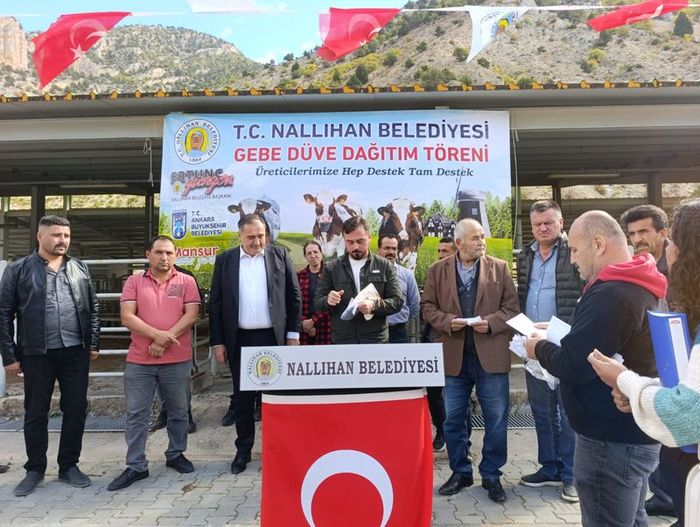 Ankara Büyükşehir Belediyesi ile Nallıhan Belediyesi işbirliğinde düzenlenen program kapsamında, hayvancılıkla uğraşan 14 üreticiye Nallıhan Belediyesi Hayvan Pazarı'nda 44 gebe düve teslim edildi.