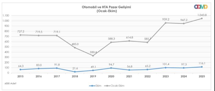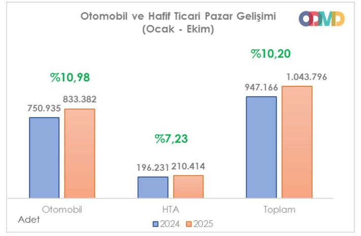 Otomotiv Distribütörleri ve Mobilite Derneği'nin (ODMD) verilerine göre, yılın ilk 10 ayında otomobil satışları geçen yılın aynı dönemine göre yüzde 11 artarak 833 bin 382 adet, hafif ticari araç satışları ise yüzde 7.23 artarak 210 bin 414 adet olarak gerçekleşti.