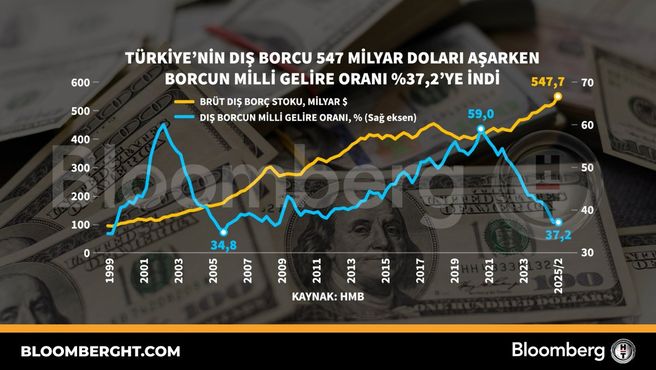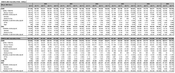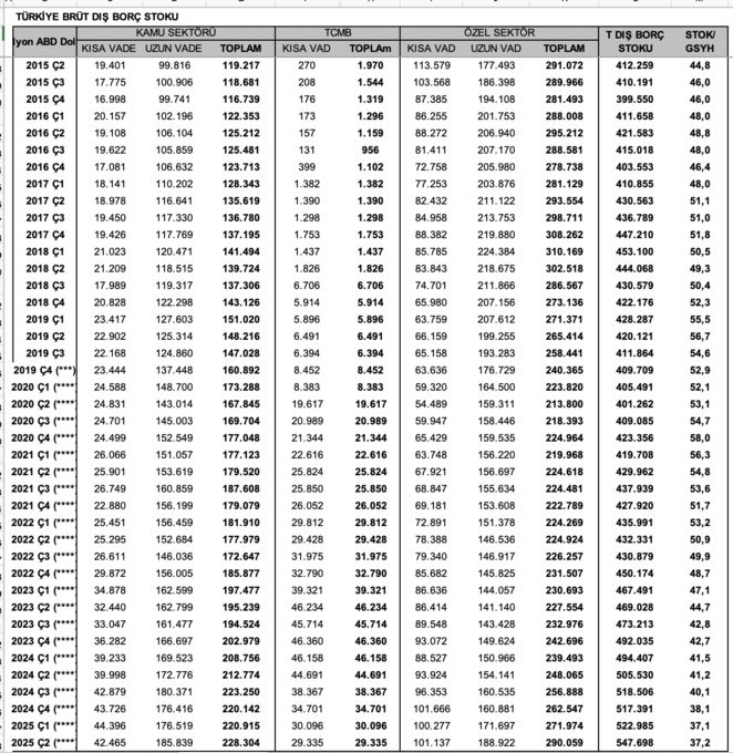 ➔ Bu yılın ikinci çeyreğine ilişkin veriler yeni açıklandı. 2023’ten 2025 ortasına kadar olan dezenflasyon politikasının uygulandığı dönemde brüt dış borç stoku, 469 milyar dolardan 547.7 milyar dolara yükseldi. İki yıllık stok artışı %16.8 oldu.