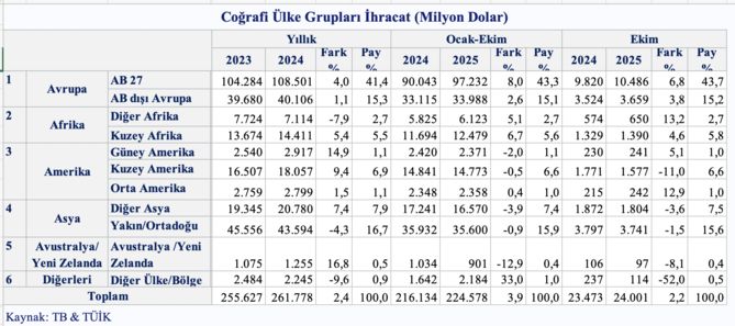 ➔Yılın 10 ayında ihracat yüzde 3.9 arttı. Küresel talebin zayıfladığı bir dönemde bu performans kötü değil, fakat parıltının kaynağı çok net: Avrupa Birliği.