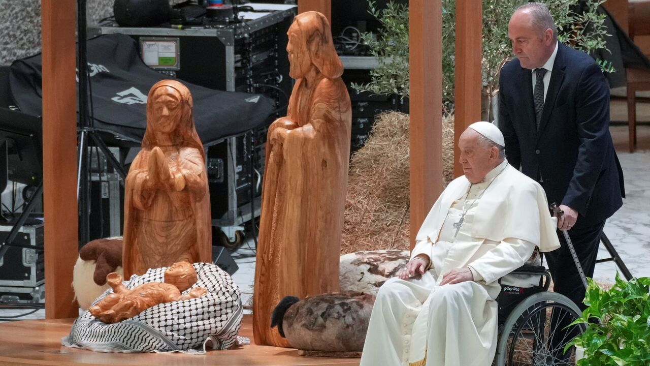 Papa, savaş trajedilerinin son bulması için dua ettiEser, İsa’nın doğum yeri olan Beytüllahim’den Johny Andonia ve Faten Nastas Mitwasi adlı iki sanatçıya ait ve Filistin Devlet Başkanı Mahmud Abbas’ın selamlarıyla Vatikan’a iletilmiş, iddiaya göre kefiye son dakikada Mitwasi tarafından serilivermiş. Mitwasi “Kefiye dini bir sembol değildir, ulusal kimliğimizin parçasıdır. Hristiyan bir Filistinli olarak Hristiyanlığın benim şehrimde doğmuş olmasından gurur duyuyorum. Doğum sahnesinde şehrimin hikayesini anlatıyorum, Beytüllahim’den ahşap, yün gibi materyallere kefiye de dahil” diyor ama kafaların içinde farklı fikirler dönüyor.