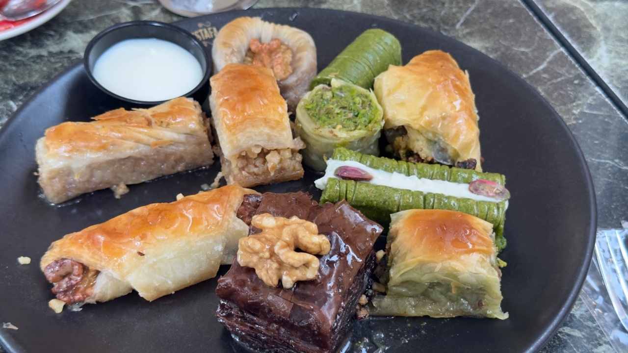 Hemen her yerde karışık tatlı tabakları 800-1000 TL arasındaydı. Pahalı sanki. Bir kilo fıstıklı baklava fiyatları: Güllüoğlu’nda 1240, Köşkeroğlu’nda 1100, Mahizer 4250 (tepsi), Mahal Antep 1250, Hafız Mustafa 1100 TL.