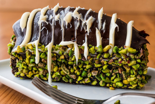 Hazırlanan ganaj sos ile pastanın tüm yüzeyini kaplayın. Kenarlarını fındık kırığı ile süsleyin ve buzdolabında kıvamlı haline gelmesi için yaklaşık 3-4 saat dinlendirin.