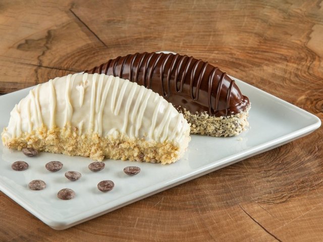 Pişen keki yarım muz genişliğinden biraz daha geniş olacak şekilde kesin. Ardından şeritleri ortadan keserek 14 küçük dikdörtgen elde edecek şekilde parçalara ayırın.