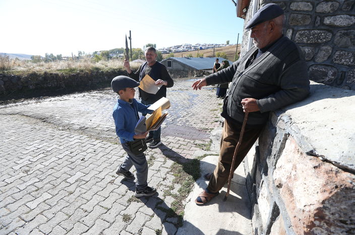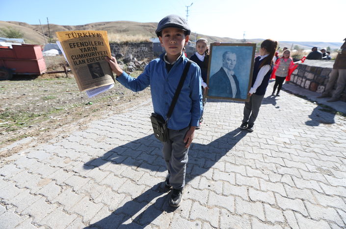 Bir öğrenci de "Efendiler yarın Cumhuriyeti ilan edeceğiz" yazılı temsili gazeteyi "Yazıyor yazıyor, yarın Cumhuriyeti ilan edeceğiz yazıyor" diyerek köylülere dağıttı.