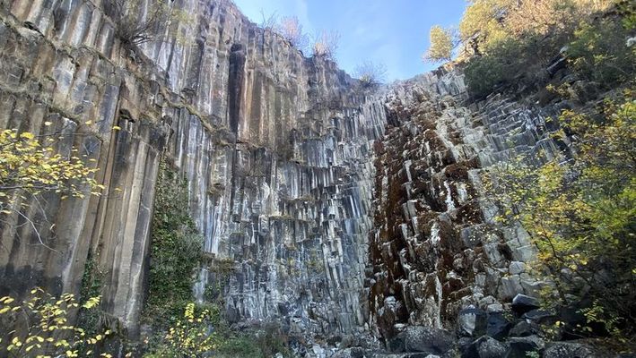Sinop'un Boyabat ilçesi Kurusaray köyünde volkanik patlama sonucu yaklaşık 5 milyon yıl önce oluştuğu tahmin edilen bazalt kayalıkları, ziyaretçilerini sonbahar renkleriyle karşılıyor