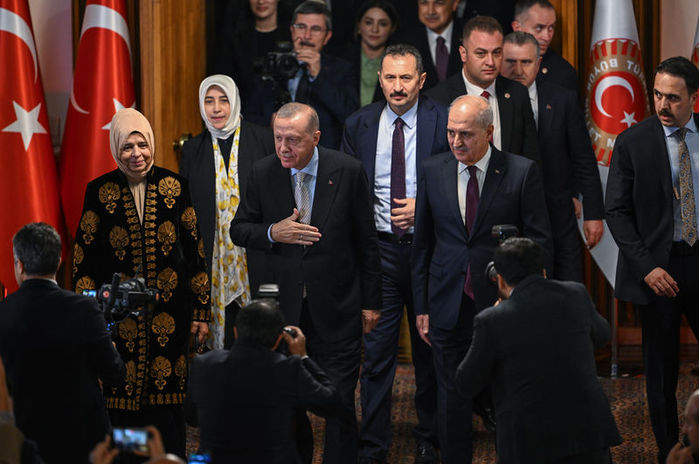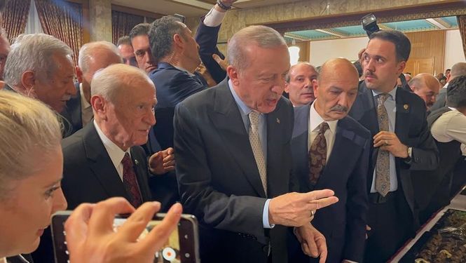 Erdoğan, MHP Genel Başkanı Devlet Bahçeli, Cumhurbaşkanı Yardımcısı Cevdet Yılmaz, DEM Parti Eş Genel Başkanları Tuncer Bakırhan ve Tülay Hatimoğulları Oruç, DEVA Partisi Genel Başkanı Ali Babacan, Gelecek Partisi Genel Başkanı Ahmet Davutoğlu, Büyük Birlik Partisi Genel Başkanı Mustafa Destici, HÜDA PAR Genel Başkanı Zekeriya Yapıcıoğlu ve milletvekilleri ile sohbet etti. ( TCCB / Murat Kula - Anadolu Ajansı )