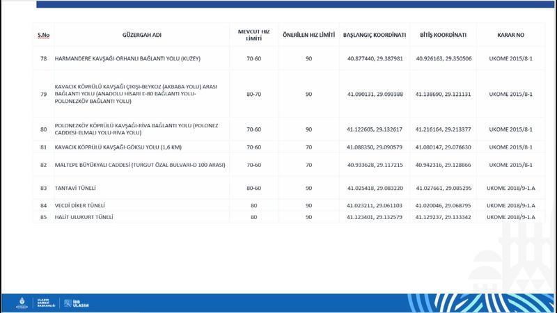 D-100 Büyükçekmece Mimar Sinan Kavşağı- Beylikdüzü (TÜYAP), D-100 Büyükçekmece Beylikdüzü (TÜYAP) - Altunizade Köprülü Kavşağı, D-100 Harem-Tuzla ,D-100 Kartal- Samandıra'da, tünellerde de Sarıyer-Çayırbaşı Tüneli, Avrasya tüneli, Tantavi Tüneli, Vecdi Diker Tüneli, Halit Ulukurt Tüneli'nde hız sınırları yeniden belirlendi.