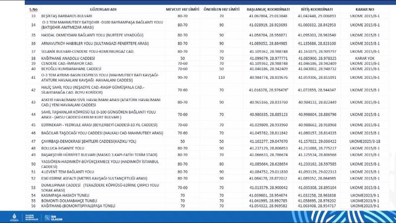 İstanbul Büyükşehir Belediyesi (İBB) Ulaşım Koordinasyon Merkezi (UKOME) toplantısında, İstanbul'da 84 güzergahta hız limitleri yenilendi. 14 bin 655 levhada değişim kararı alınırken, 31 Aralık'a kadar tabelaların değişmesi bekleniyor
