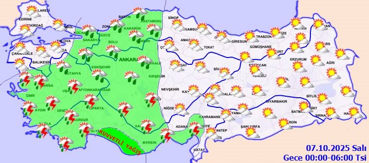Meteoroloji Genel Müdürlüğü tarafından yapılan tahminlere göre: Ülkemizin kuzey, iç ve batı kesimlerinin parçalı ve çok bulutlu, Marmara, Ege, Batı Akdeniz ile Ankara'nın batısı, Eskişehir. Bolu ve Düzce çevrelerinin sağanak ve gök gürültülü sağanak yağışlı, diğer yerlerin az bulutlu ve açık geçeceği tahmin ediliyor. Yağışların; Marmara, Ege ve Batı Akdeniz ile Ankara’nın batı ilçeleri ve Eskişehir çevrelerinde kuvvetli, Güney ve Kuzey Ege kıyılarında çok kuvvetli ve yerel şiddetli olması bekleniyor. Rüzgarın; İç Anadolu’nun güney ve doğusu, Doğu Karadeniz’in iç kesimleri ile Doğu Anadolu’nun kuzeyinde güneyli yönlerden kuvvetli olarak (40-60 km/saat) esmesi bekleniyor.