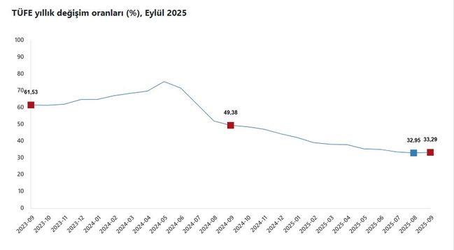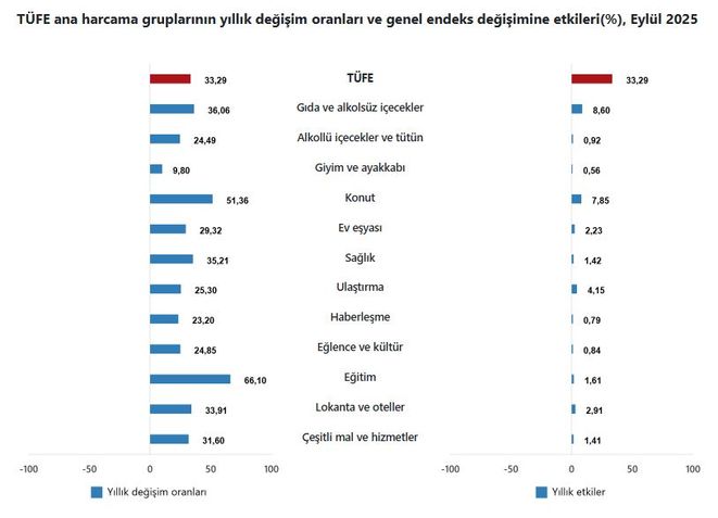 Eylül ayında aylık enflasyon yüzde 3.23, yıllık enflasyon yüzde 33.29 oldu. Mayıs 2024'ten bu yana yıllık enflasyonda ilk kez artış yaşandı. Eylülde manşet enflasyona en yüksek katkı endeksteki ağırlığı sebebiyle gıda ve alkolsüz içeceklerden geldi. Ancak eğitim, aylık yüzde 17.9, yıllık ise yüzde 66.1'lik yükselişle en yüksek fiyat artışlarının kaydedildiği grup oldu