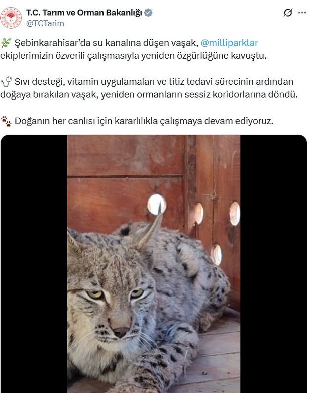 Paylaşımda, "Şebinkarahisar'da su kanalına düşen vaşak, Milli Parklar ekiplerimizin özverili çalışmasıyla yeniden özgürlüğüne kavuştu. Sıvı desteği, vitamin uygulamaları ve titiz tedavi sürecinin ardından doğaya bırakılan vaşak, yeniden ormanların sessiz koridorlarına döndü" ifadelerine yer verildi.