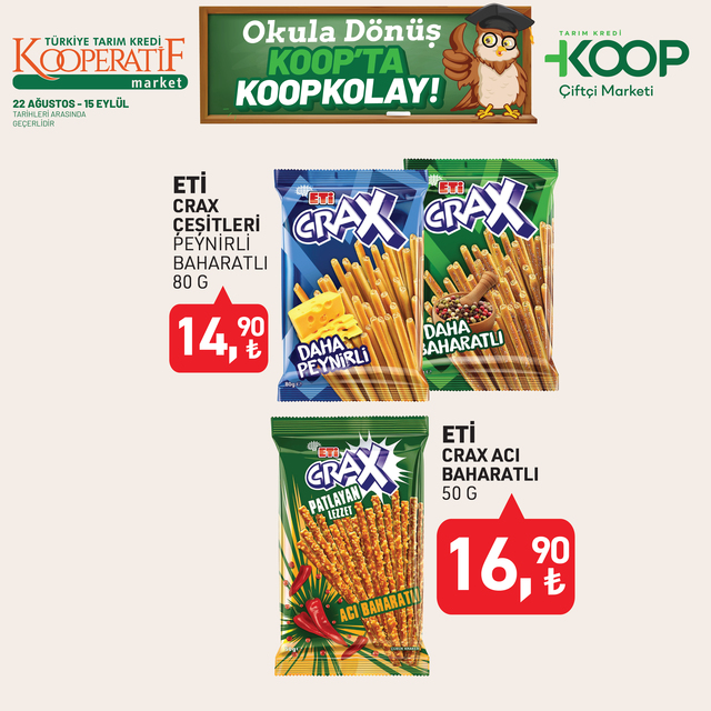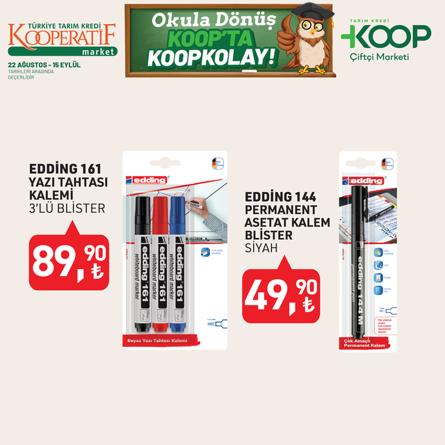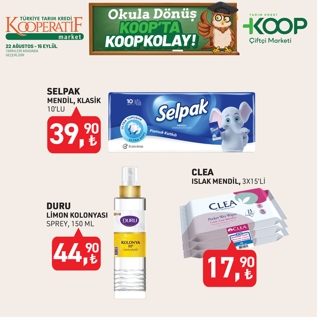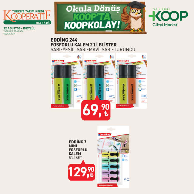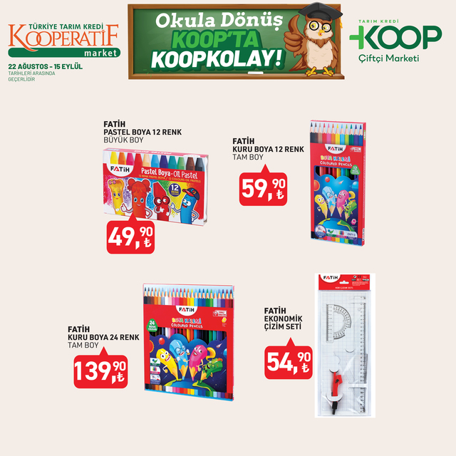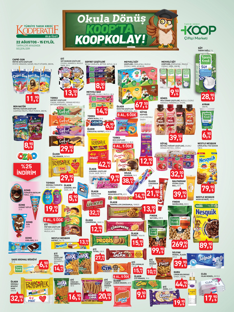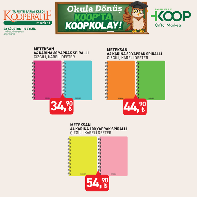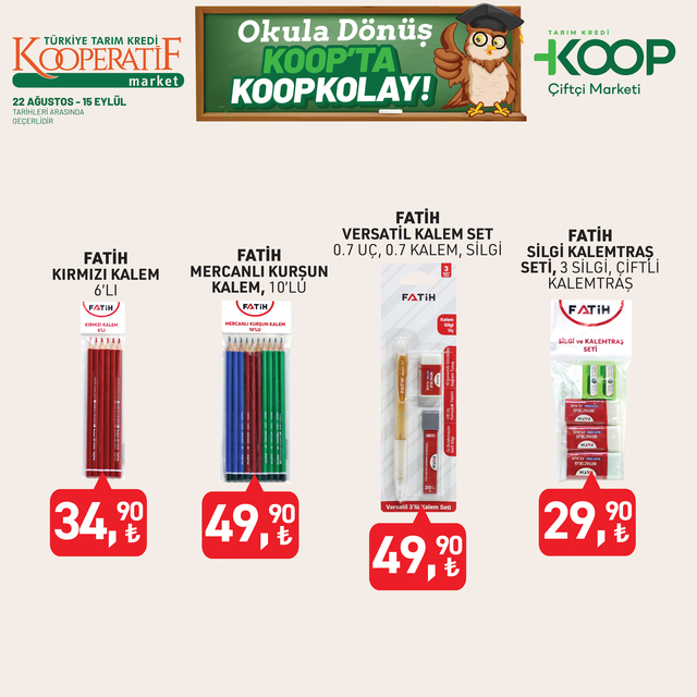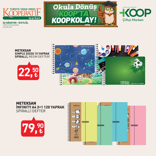 Tarım Kredi Kooperatif Market indirim listesi yayınlandı. 15 Eylül’e kadar devam edecek KOOP indirim kataloğunda yine birbirinden özel ürünler dikkat çekti. Defter, kalem, zımba seti, silgi, pastel boya, fosforlu kalem indirimde olacak. İşte, 22 Ağustos- 15 Eylül 2025 Tarım Kredi Market aktüel broşürü indirimli ürün fiyatları listesi...
