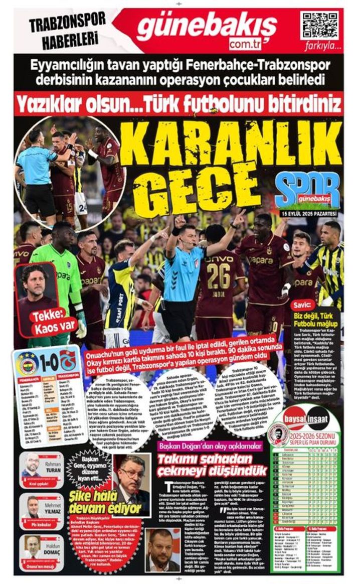 Öte yandan Trabzon’da yayın yapan yerel gazeteler de bordo-mavili takımın Fenerbahçe karşısında alınan mağlubiyette başlıklarında, hakem kararlarının etkili olduğuna vurgu yaptı. Trabzon yerel basın manşetleri şu şekilde: