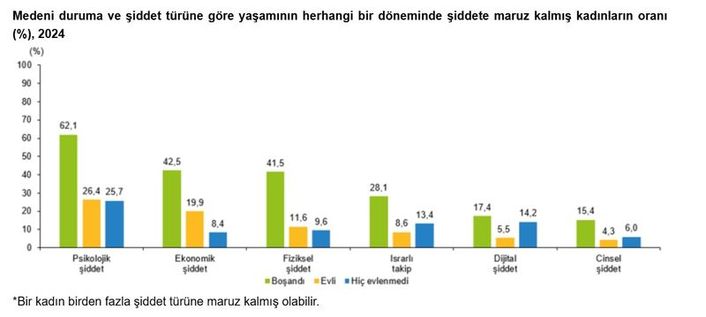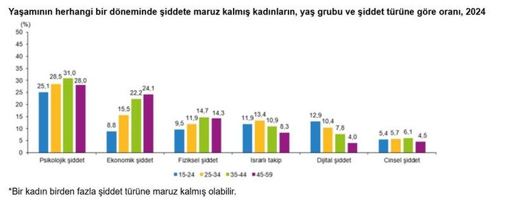 Buna göre; yaşamının herhangi bir döneminde kadınların yüzde 28,2'si psikolojik, yüzde 18,3'ü ekonomik, yüzde 12,8'i ise fiziksel şiddete uğradı. Tüm şiddet türleri yaş grubuna göre incelendiğinde, yaşamının herhangi bir döneminde fiziksel şiddete en yüksek oranda 35-44 yaş grubundaki kadınlar maruz kaldı. Bu yaş grubunu sırasıyla yüzde 14,3 ile 45-59 yaş grubundaki kadınlar, yüzde 11,9 ile 25-34 yaş grubundaki kadınlar takip etti. Yaşamının herhangi bir döneminde maruz kalınan şiddet değerlendirildiğinde, boşanan kadınların yüzde 62,1'i psikolojik, yüzde 42,5'i ekonomik, yüzde 41,5'i ise fiziksel şiddete maruz kalırken; evli kadınların yüzde 26,4'ü psikolojik, yüzde 19,9'u ekonomik, yüzde 11,6'sı ise fiziksel şiddete maruz kaldı. Hiç evlenmeyen kadınların yüzde 25,7'si psikolojik şiddete, yüzde 14,2'si dijital şiddete, yüzde 13,4'ü ise ısrarlı takibe maruz kaldı. Yaşamının herhangi bir döneminde şiddete maruz kalmış kadınlar, şiddeti uygulayan kişilere göre incelendiğinde, dijital şiddette yabancı biri yüzde 62,3 ile ilk sıradayken, eş/eski eş/birlikte olduğu kişi yüzde 15,7 ile ikinci sırada yer aldı. Israrlı takipte ise ilk sırayı yüzde 39,6 ile yabancı biri alırken, ikinci sırayı yüzde 32,1 ile eş/eski eş/birlikte olduğu kişi aldı.