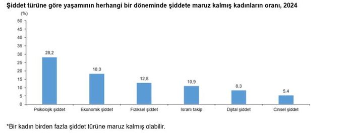 Türkiye İstatistik Kurumu'nun (TÜİK) yayımladığı Türkiye Kadına Yönelik Şiddet Araştırması'na göre, yaşamının herhangi bir döneminde kadınların yüzde 28,2'si psikolojik, yüzde 18,3'ü ekonomik, yüzde 12,8'i ise fiziksel şiddete uğradı.