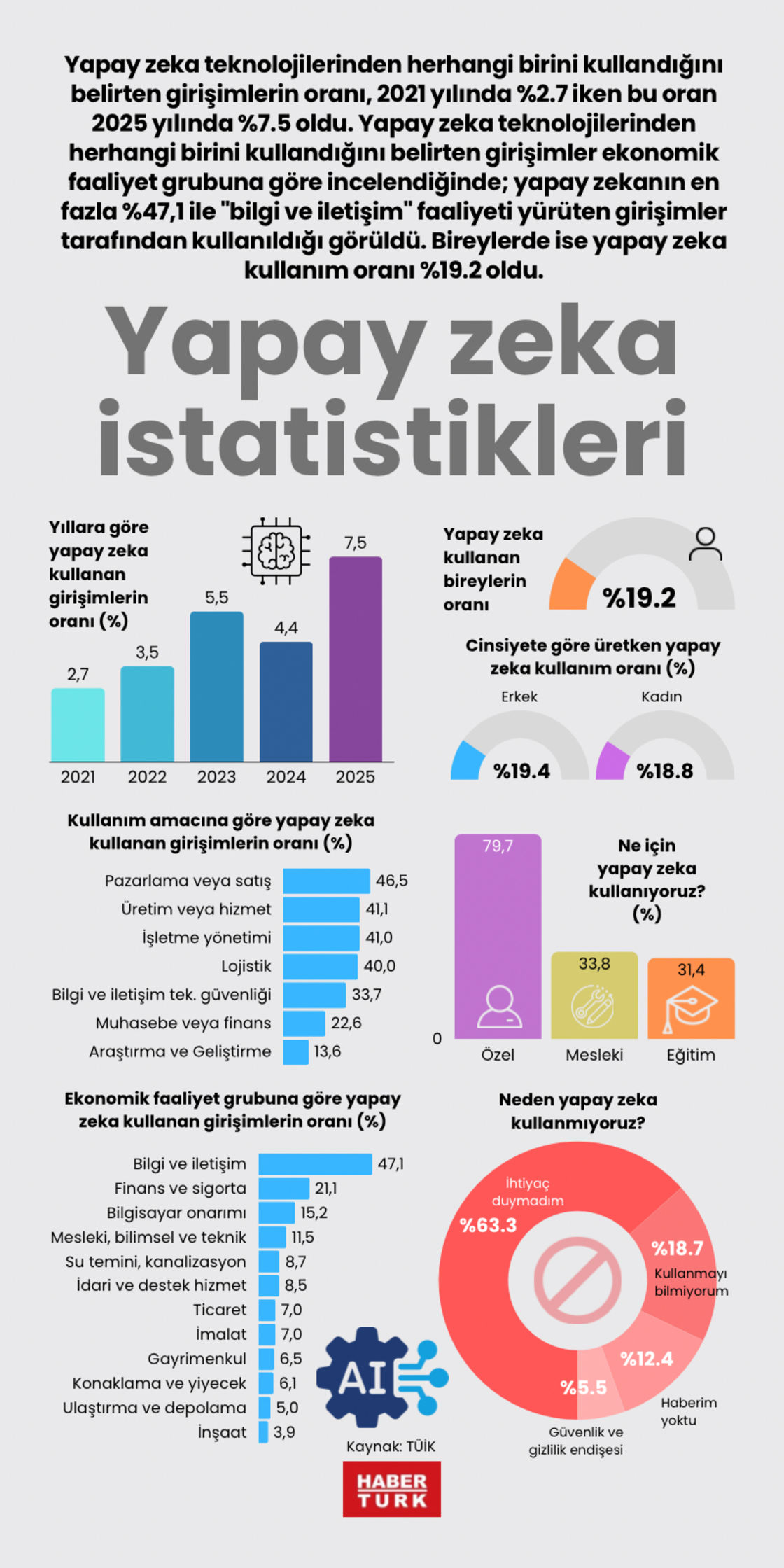 Yapay zeka teknolojilerinden herhangi birini kullandığını belirten girişimlerin oranı, 2021 yılında %2.7 iken bu oran 2025 yılında %7.5 oldu. Yapay zeka teknolojilerinden herhangi birini kullandığını belirten girişimler ekonomik faaliyet grubuna göre incelendiğinde; yapay zekanın en fazla %47,1 ile "bilgi ve iletişim" faaliyeti yürüten girişimler tarafından kullanıldığı görüldü. Bireylerde ise yapay zeka kullanım oranı %19.2 oldu.